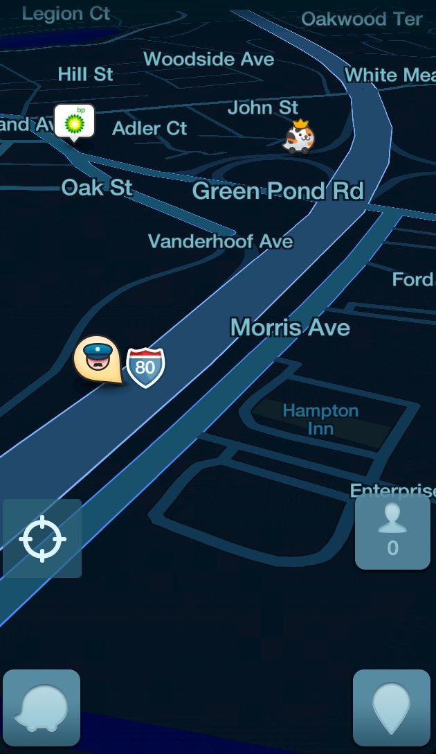 Take a look at the screen shot that accompanies this post. It highlights a part of the Route 80 corridor in Northwest New Jersey. The little policeman head indicates there is a police presence. Waze received this information from an alert driver (or hopefully passenger) that saw the issue and notified Waze. The cat with the crown is a fellow Wazer a mile away. This is tracked by Waze’s computers using your GPS coordinates passed on to Waze by your smartphone. If you need gas, there’s a BP nearby as seen in the upper left. This is a screen shot taken on a Saturday night so you don’t see a lot of activity on the screen. If it was during the day on a weekday, you would see far more activity as Route 80 is a parking lot during rush hour. You will also see some rather interesting activity as the app permits Map Chat where drivers who don’t know each other can strike up chats.